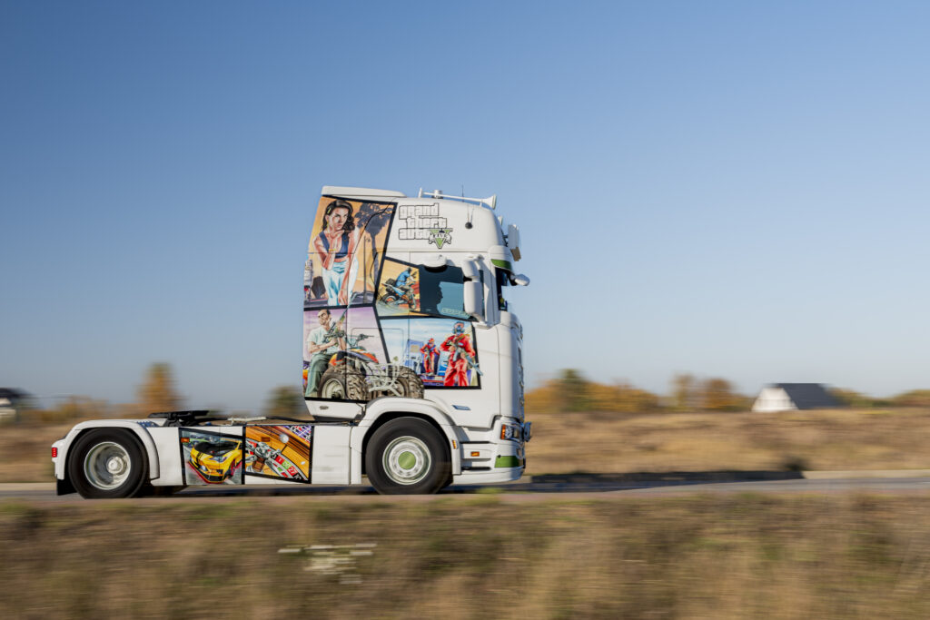 – Pojazd, który tu widzimy, to Scania 560S z motywem GTA V, wykonanym u nas na warsztacie przez naszych lakierników. Malowanie jest nałożone aerografem. Niektórzy myślą, że to są naklejki, ale u nas wszystko jest wykonane ręcznie. Środek został stworzony w całości w firmie TapCar Żukowo. Wnętrze jest czarno-zielone, dosyć jaskrawe, ale mnie się podoba. Scania została ukończona w tym roku i była dla mnie miłą niespodzianką. Szefostwo firmy przekazało mi ją 1 czerwca, czyli w Dzień Dziecka.